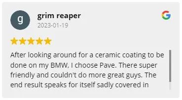 After looking around for a ceramic coating to be done on my BMW, I choose Pave. There super friendly and couldn't do more great guys. The end result speaks for itself sadly covered in snow but the shots at night show the work